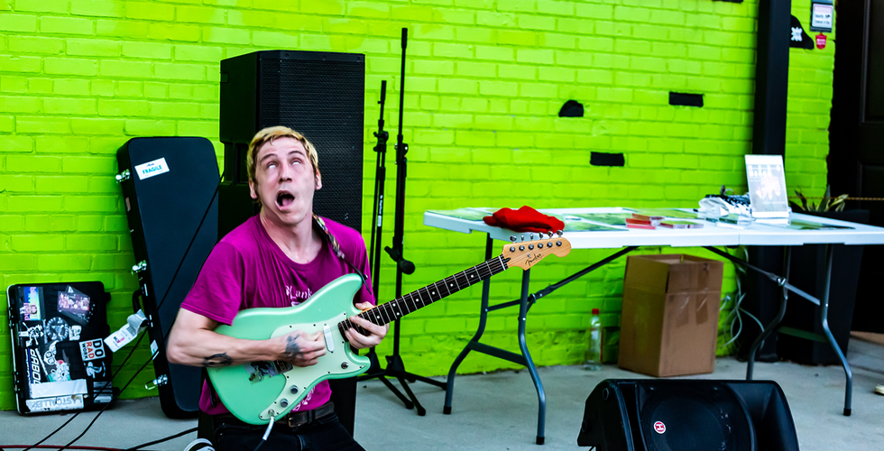 Slideshow of HXXS performing one of their songs on MOD's Back Patio, New Obsessions performing, HXXS on his knees, and New Obsessions (photos by Kat Day)